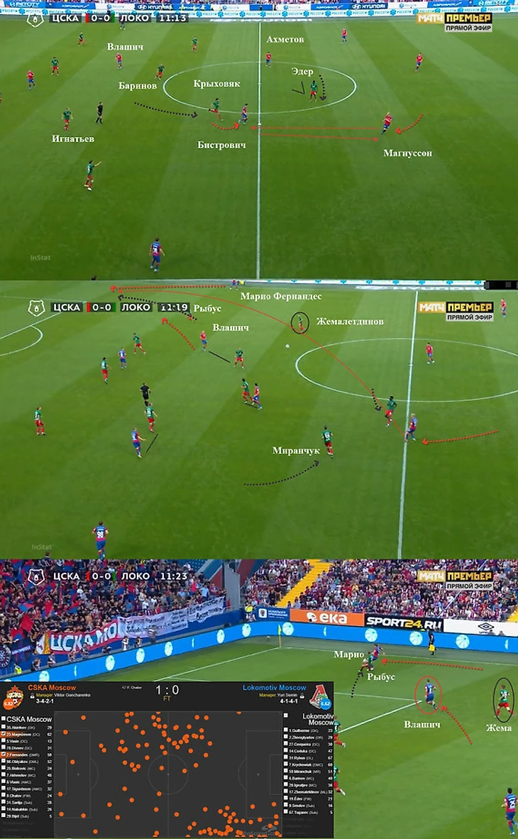 Передачи в полуфланг мимо Влашича, на Жемалетдинова, могли проходить, но его неплохо накрывал Дивеев, плюс ЦСКА быстро отскакивал назад в таких случаях – Влашич, Ахметов и Фернандес могли помочь партнеру в такой ситуации. Доставить же Миранчуку мяч из такой позиции было крайне тяжело, так как Бистрович старался ещё и перекрывать линию передач на Алексея, садясь ниже; более того, Миранчука без мяча контролировали одновременно и Магнуссон, и Обляков.