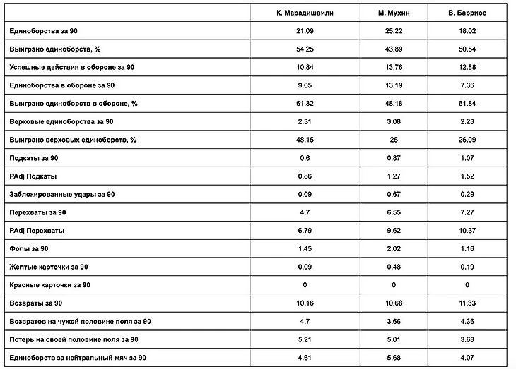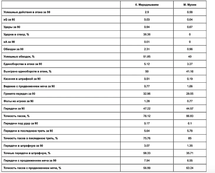 Если сравнивать статистику Мухина с Марадишвили (взята весенняя часть сезона, РПЛ и Кубок России), то тенденция улавливается: Максим даёт больше оборонительных единоборств, больше единоборств за нейтральный мяч и выполняет больше перехватов — как в пересчёте на 90 минут, так и на владение собственной команды (PAdj-перехваты). Но эффективность Мухину нужно повышать: он нестабильно ведёт микродуэли, его могут продавливать мощью (пример — Мозес в матче со «Спартаком»), плюс мяч после его отборов часто повторно оказывается у соперника. И поэтому статистические компании засчитывают единоборство как проигранное.