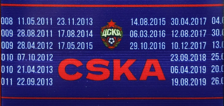 Знак отличия капитана в этой игре посвящен истории дерби. Как видите, на повязке отображены даты противостояний непримиримых соперников. Конкретно в этот день случился 59-й матч между армейцами и спартаковцами в чемпионатах России.