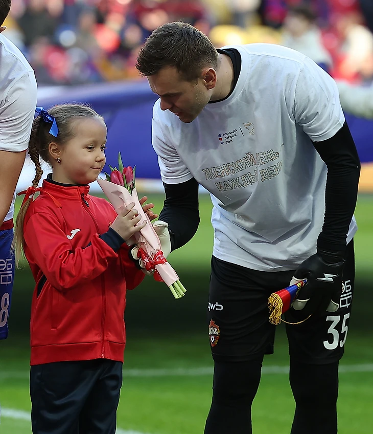 8 марта 2025 года. «ВЭБ Арена». ЦСКА — «Химки» — 1:0. Игорь Акинфеев вручает букет юной болельщице. Фото Александр Федоров, «СЭ»
