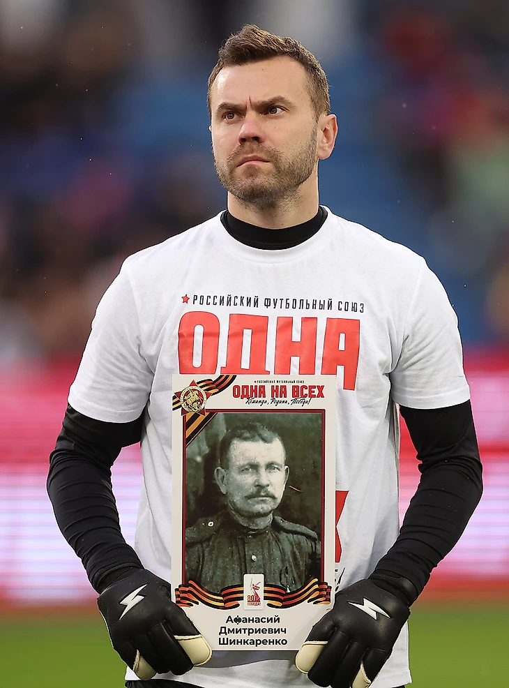 28-й тур. 10 мая 2025 года. ЦСКА — «Краснодар» — 1:0. Повязка-посвящение прадеду Игоря — рядовому стрелковой дивизии Афанасию Дмитриевичу Шинкаренко. Он прошел Великую отечественную войну, был награжден орденом Славы III степени и орденом Отечественной войны II степени. Игорь сам выбрал это изображение — отыскал в домашнем архиве фотографию и попросил дизайнера передать ее на повязке. Низкий поклон и светлая память!