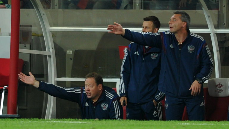5 сентября. Москва. Тушино. Россия - Швеция - 1:0. Леонид СЛУЦКИЙ, Сергей СЕМАК и Сергей ОВЧИННИКОВ. Фото Никита УСПЕНСКИЙ, "СЭ"