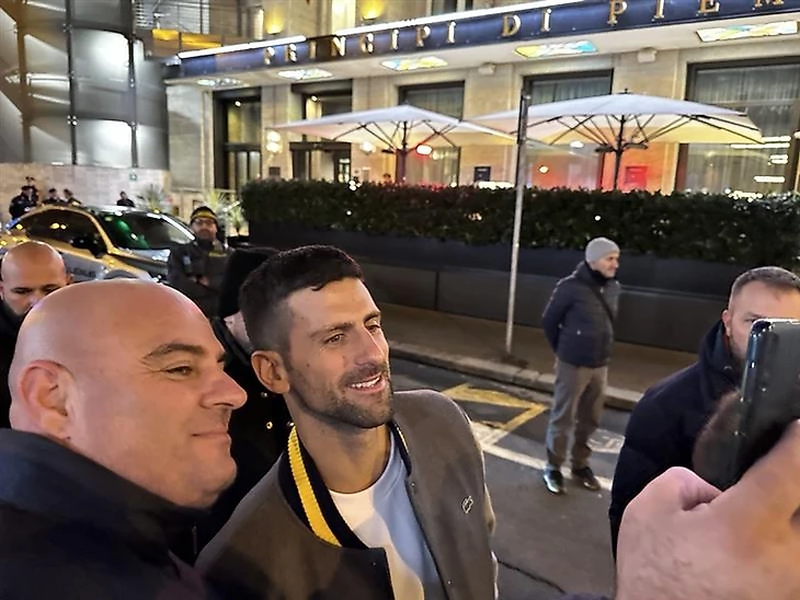 Площадка у отеля символически ограждена невысокими заборчиками. На дежурстве – с десяток блюстителей закона, которые при первом вежливом вопросе бегло отвечают на двух языках, кто из восьмерки уже в отеле, кого еще ждать с тренировки, а кого – с вечерней прогулки. К примеру, на фото выше, за день до старта турнира, Новак Джокович посетил поединок «Ювентус» – «Кальяри» и поддержал земляка Душана Влаховича.
