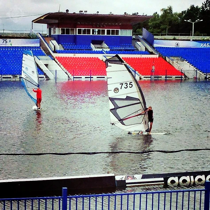 Комсомольск-на-Амуре. Объяснения тому, что стадион из "города юности" появляется тут чаще всех прочих - нет. Просто нравится. Восточнее нет больших арен. Один из крайних форпостов большого футбола большой страны