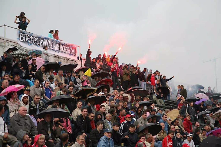 Фанаты "Вулкана" на матче местных старожил против ветеранов киевского "Динамо". Да, не поверите, но у несуществующего клуба до сих пор есть фанаты: лучшие друзья ультрас "Луча"