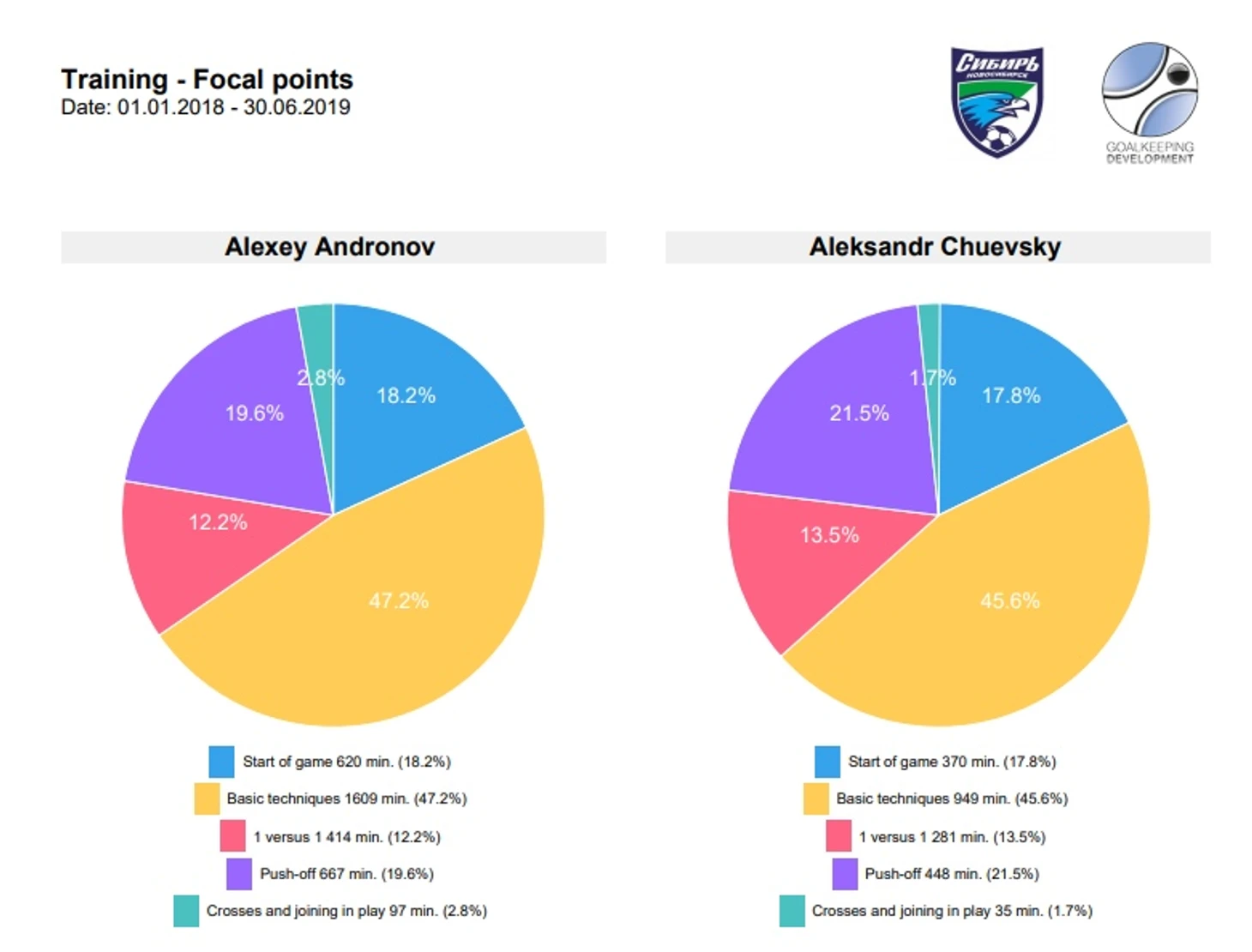 Для составления рисунков я пользуюсь Tactics Manager от Soccer Tutor. Довольно удобная и интуитивно понятная программа, которую тянет даже мой старый ноутбук. Позволяет сохранять тренировки в отдельные сессии, но я эту функцию не использую, пользуясь по старинке встроенными в винду ножницами, вырезая нужный мне фрагмент картинки.Конспекты, как и большинство тренеров, пишу в Ворде, либо от руки в блокноте. Стараюсь контролировать то, что я делаю, часто заглядываю в старые записи. Мониторинг посещаемости я провожу с помощью сайта Goalkeeping Development. Это немецкий софт, который позволяет расписать поминутно каждое занятие с вратарями. В Goalkeeping Development можно учесть каждый аспект твоего занятия. Узнать - как много времени ты работаешь над различными аспектами игры вратаря. Сравнить вратарей одного возраста между собой и с другими ребятами, например, год назад. К тому же, GD дает довольно приятную инфографику. Например, так выглядит направленность занятий двух вратарей 2008 года.