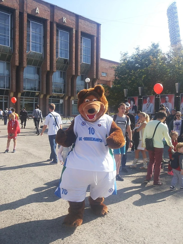 пришли гости: талисман  баскетбольного «Новосибирска» медведь Топтыгин,