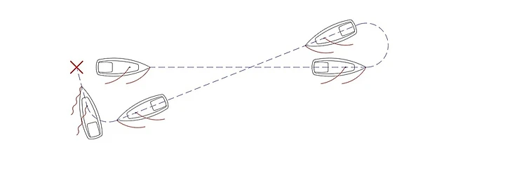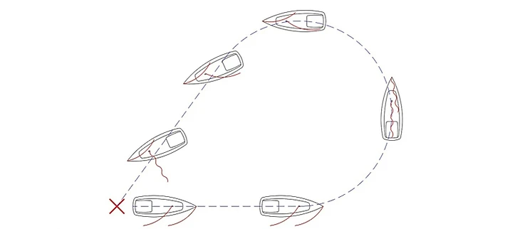 2. Двигаться в галфвинд 5−10 длин корпуса. Проще считать вслух, чтобы лучше контролировать расстояние.