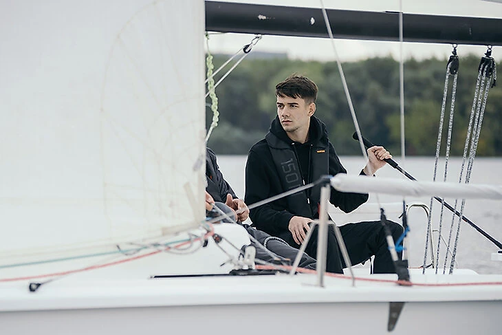 Перед тренировкой Данил надел компактный спасательный жилет черного цвета, сначала слушал инструктора Игоря, а затем сам работал и радовался – как быстро яхта скользит по воде и как командная работа позволяет делать резкие повороты и набирать скорость.