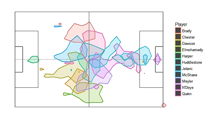Первым очевидным шагом является отображение местоположений игрока на поле. В качестве примера взяты три футболиста, участвовавших в матче “Халл Сити”-”Манчестер Юнайтед”, состоявшемся в последний день сезона 2014/2015. “Халл” всеми силами пытался избежать вылета, но встреча завершилась безголевой ничьей.