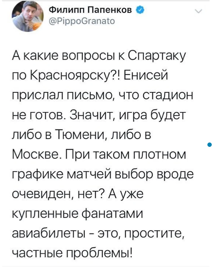 Или же спорит на 10 миллионов рублей с Максимом Алланазаровым в ответ на вопрос о том, почему «Спартак» подробно не объяснил причины расставания с Массимо Каррерой. Статьи Трахтенберга на официальном сайте клуба воняют нафталином и ничем не отличаются от его заметок советских времен. Но если тогда это было актуально, то сейчас выглядит как кусочек засохшего говна на красно-белом полотне. Впрочем, есть у спартаковской пресс-службы и другие герои. Например, Филипп Папенков, который написал о предполагаемом переносе матча «Енисей» – «Спартак» в другой город следующее: