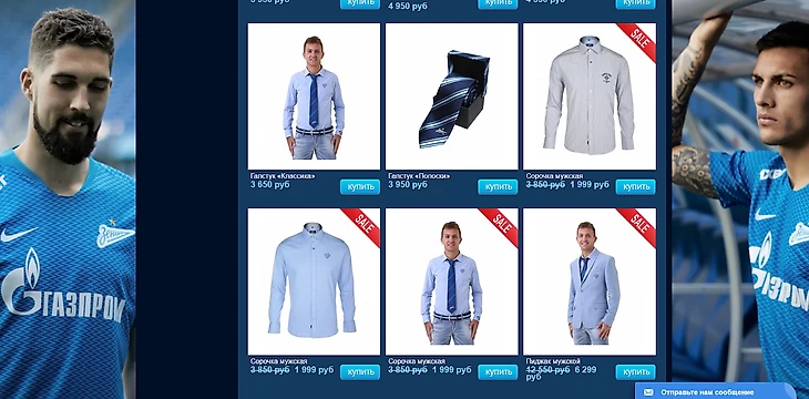Но ладно. Снова лезу на сайт «Зенита» (все-таки главный соперник для «Спартака»), там просто безумный выбор мужской одежды: водолазки, деловые костюмы, рубашки, ремни, галстуки, худи, поло и так далее. Например: