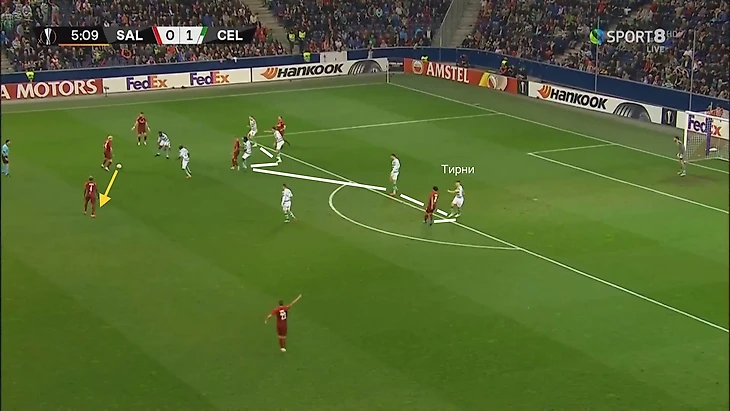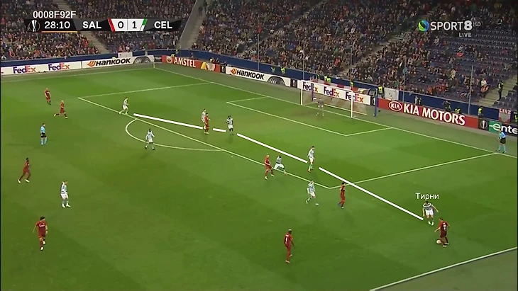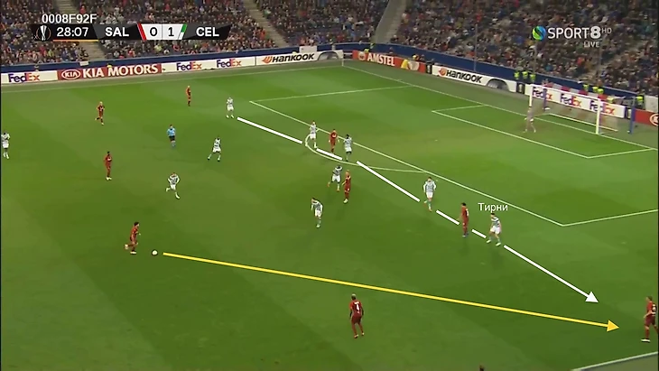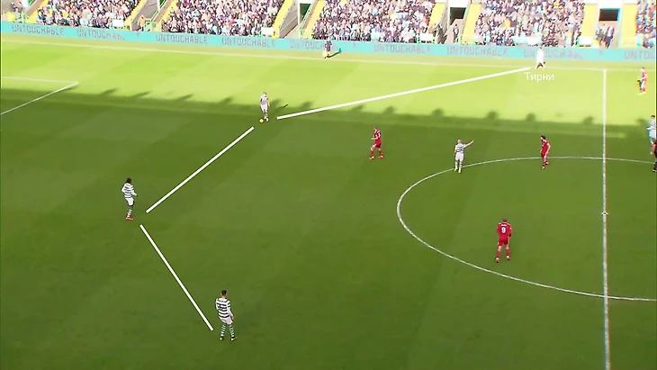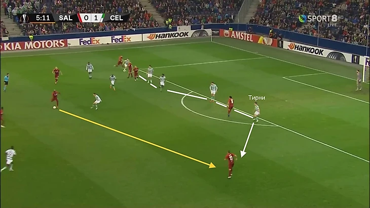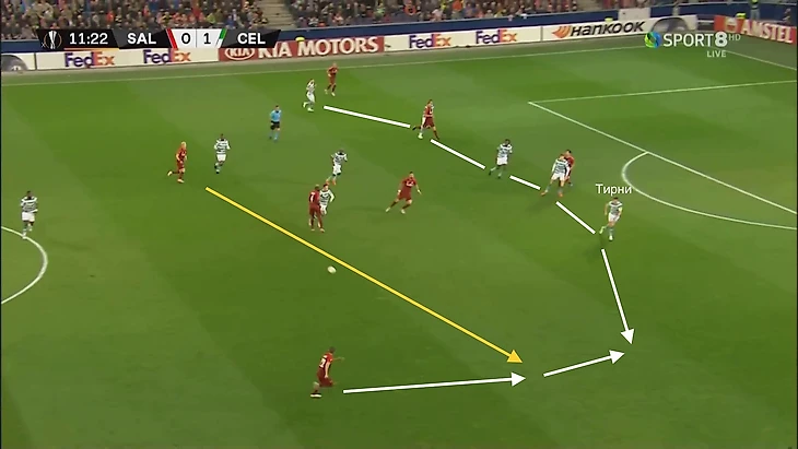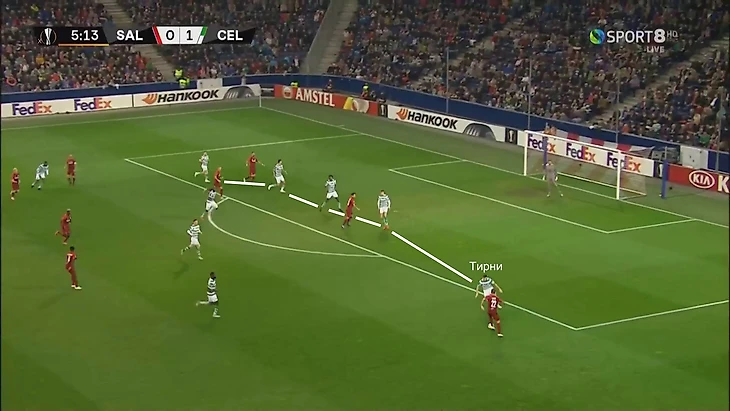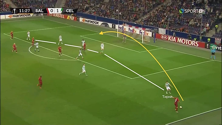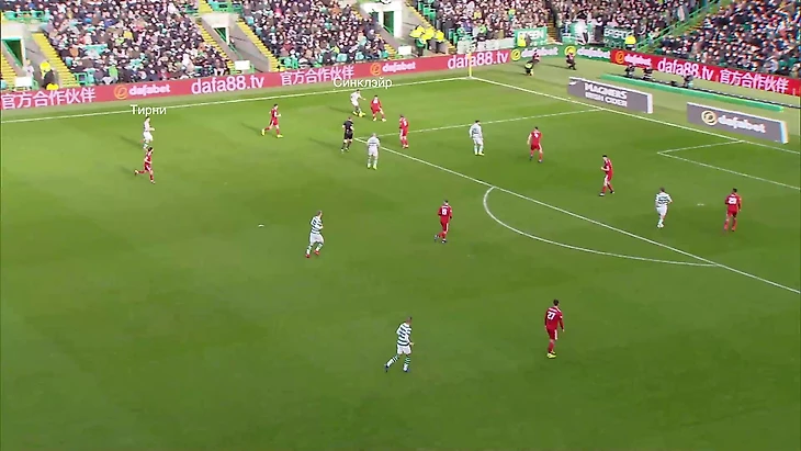 В финальной трети поля Тирни располагается не так высоко, как Колашинац — ширину в атаке «Селтика» часто создает вингер, так что Киран располагается немного ниже и иногда уходит в полуфланг для подыгрыша. Отсюда и сильно большее количество передач в финальной трети и сравнимое количество передач в штрафную, которое не должно вводить в ступор. Как пример: