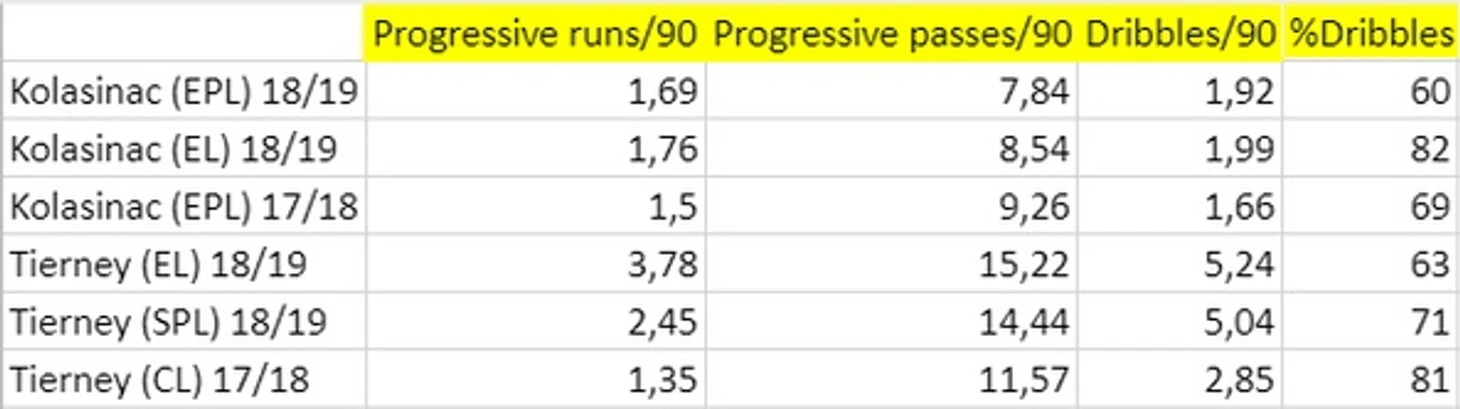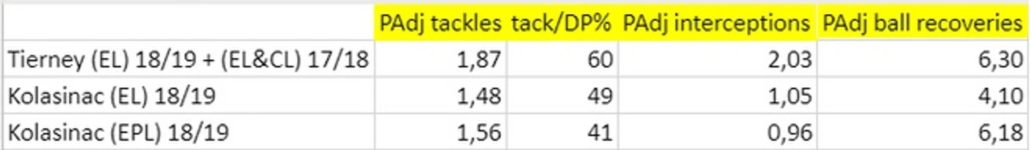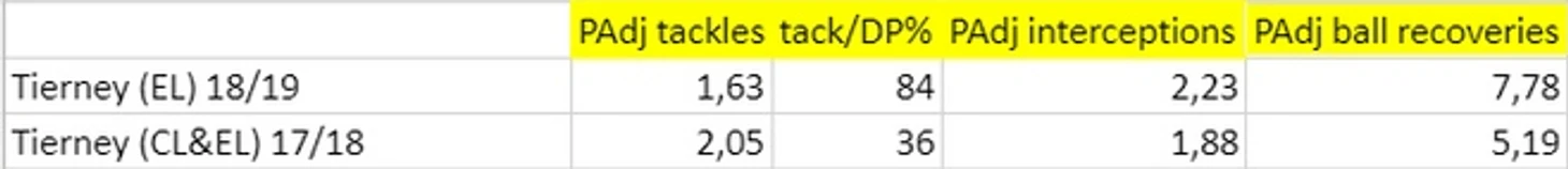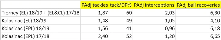 Тирни выглядел сильно круче боснийца в последней ЛЕ - у шотландца на 11% больше истинных отборов (tack/DP%), то есть отборов, возвращающих команде владение. У Тирни также в 2 раза больше перехватов и больше возвращений мяча (вся статистика скорректирована на владение). На самом деле цифры могли быть еще внушительнее, немного подпортил их групповой этап ЛЧ 17/18, где «Селтик» сыграл по два матча против «ПСЖ» и «Баварии», проиграв их с общим счетом 2:17.