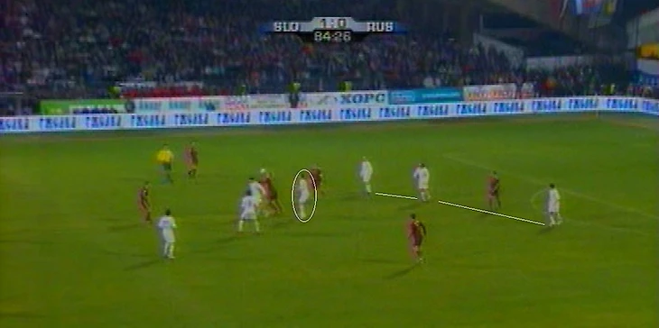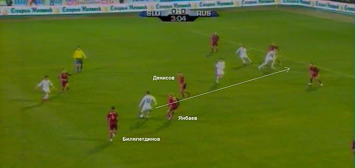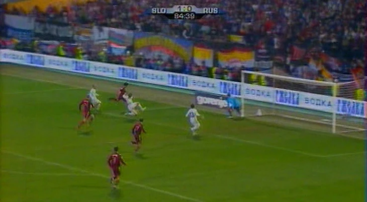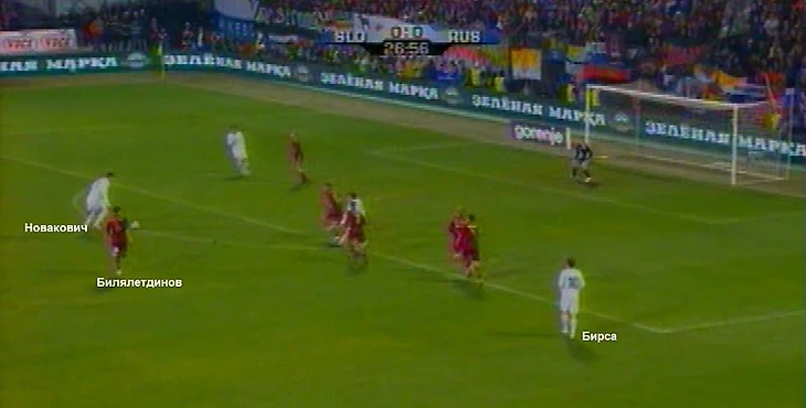 Атака перешла на правый край, Бирса в очередной раз сместился к полуфлангу и без сопротивления (отметим в очередной раз пассивные действия хавбеков сборной России, в частности, Билялетдинова) вырезал навес, который замкнул Дедич: