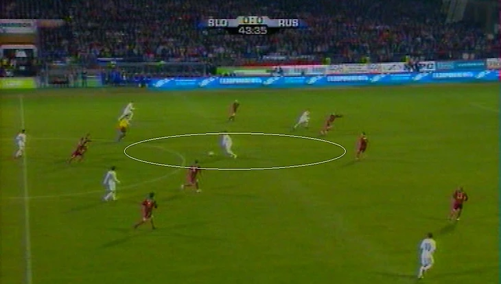 Словенцы предсказуемо отказались от игры в низком блоке и шли в высокий прессинг — такой простой ход завел сборную России на первых минутах в тупик, команде не хватало движения и свободного пространства. К 10-й минуте команда Кека организовала выход Новаковича и атаку, после которой Игнашевич срезал мяч в штангу. Наметилась и неприятная тенденция — словенцы превосходили сборную России по количеству выигранных единоборств. А свободные зоны на нашей половине поля появлялись регулярно. Ниже эпизод, когда Билялетдинов в очередной раз пешком возвращается в оборону, а передачу Бирсы на Новаковича не накрывает Янбаев. Момент закончился ударом в створ.
