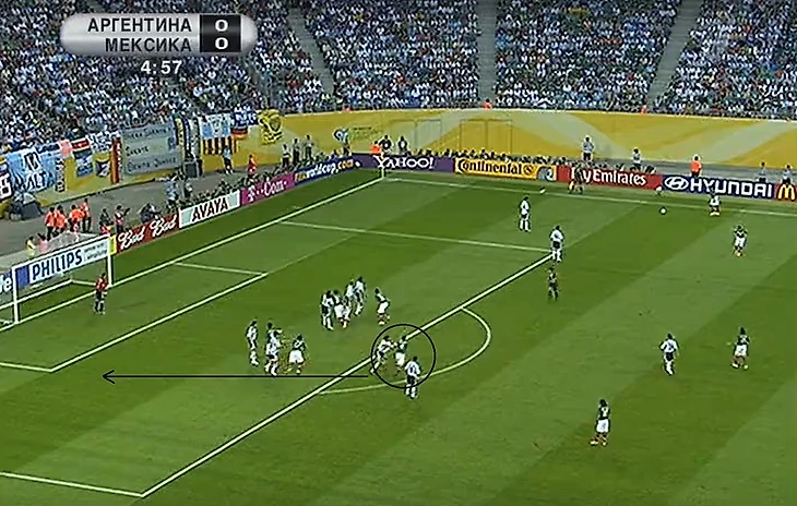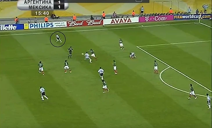 Быстрые комбинационные переходы аргентинцев, столь запомнившиеся по групповому этапу, вязли в оборонительном киселе сборной Мексики — к тому же, всегда существовал риск ответных атак. Вот типичный эпизод с расположением Сорина после потери мяча, Маркес после перехвата уже разворачивал атаку в свободную зону, но аргентинцы прервали этот выпад только ценой фола.