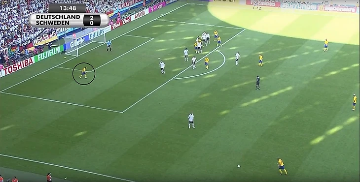 Приятно удивил уровень работы немцев в единоборствах и сам темп работы без мяча — бундестим в первом тайме превосходила соперника по всем параметрам, Баллак и Фрингс регулярно находили свободные зоны в пределах треугольника Линдерот-Чельстрем-Юнгберг, а редкие переходы шведов в атаку заканчивались грамотными включениями в отбор Метцельдера и Мертезакера.