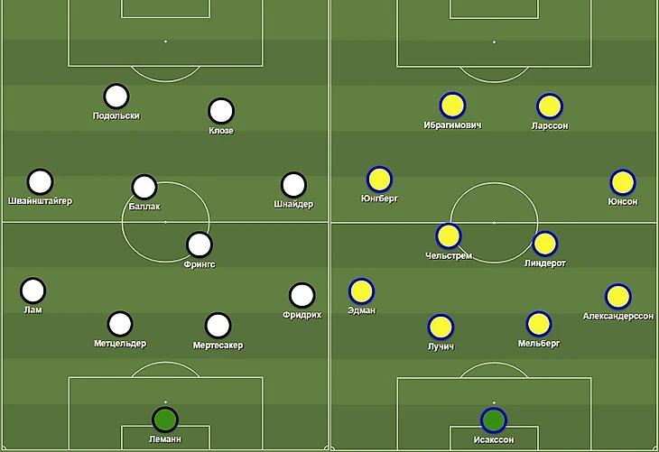 Германия подошла к первому матчу плей-офф в оптимальном составе — Метцельдер оперативно залечил свое повреждение и вернулся в стартовый состав. А вот у шведов до конца стоял вопрос с готовностью Златана Ибрагимовича, который получил на групповом этапе травму паха и пропустил игру с англичанами. В итоге, форвард «Ювентуса» все-таки попал в стартовый состав. Из интересных решений Лагербека стоит отметить появление на правом фланге атаки Юнсона, вместо которого все ожидали увидеть Вильгельмссона.