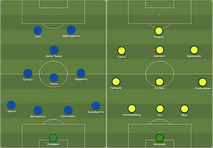Наоборот, итальянцы старательно оборонялись — в этом компоненте Матерацци, Каннаваро, Гроссо, Дзамбротта и Гаттузо находились на совершенно другом уровне. Так что территориальное преимущество австралийцев было стерильным, хотя и впечатляло. Из опасных моментов в первом тайме можно было выделить только стандарт, закончившийся ударом в упор Чипперфилда — выручил Буффон.