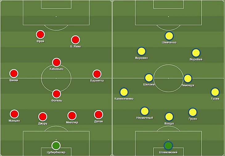 После матча с Тунисом команда Блохина осталась без Русола и Свидерского, так что Блохин выкатил крайне любопытное сочетание. Тройку ЦЗ составили Гусин, Ващук и Несмачный, роли латералей выполняли Калиниченко и Гусев, в центре расположились Тимощук и Шелаев, ну и номинально выше располагались три форварда — Воронин, Воробей и Шевченко, хотя чистым по такой схеме был только капитан сборной Украины.