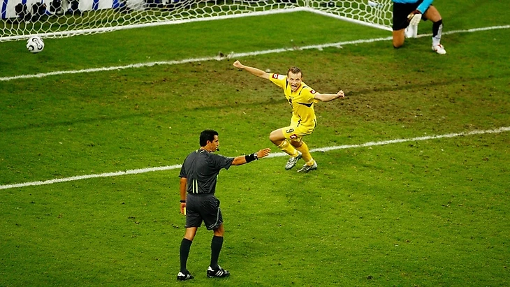 Еще по групповому этапу было крайне заметно системное влияние методов Гуса Хиддинка на сборную Австралии. С тактической точки зрения это была одна из самых гибких и интересных команд того турнира. Удивительные замены Хиддинка помогли австралийцам переломить ход игр с японцами и хорватами, а сама игровая схема по тем временам была более чем уникальной. Базис строился на расположении 3-6-1, которые в атаке превращались в 3-3-3-1, причем это были даже не более привычные 5-3-2, к примеру, или 5-4-1. Австралия играла крайне широко и резко меняла схему в зависимости от ситуации на поле. У Хиддинка была собрана универсальная команда — все игроки легко меняли свои позиции.