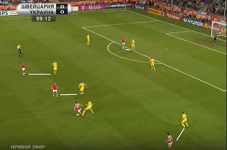 Во втором тайме сценарий практически не изменился — украинцы были чуть острее, так как без Джуру кроссы представляли для Швейцарии определенную опасность, пару голевых моментов у Украины как раз возникли после фланговых подач. Даже замены от Куна и Блохина были исключительно по позициям. Такая тягомотина пахла не то что овертаймом — сразу серией пенальти. Судите сами, какими маленькими силами атаковала заметно уставшая Швейцария, и как компактно оборонялись украинцы.