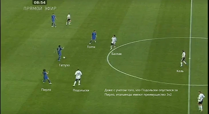 При наличии в составе Андреа Пирло не воспользоваться подобным – глупость. В первом тайме атакующая игра итальянцев строилась из глубины. Приходивший на свою треть поля Тотти помогал в билд-апе.