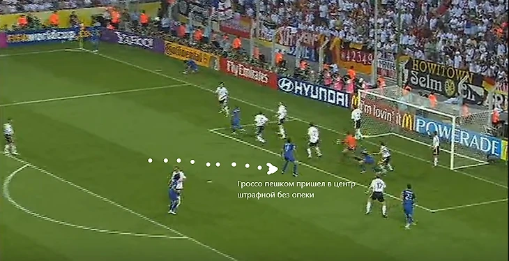 На гифке идеально заметен путь Гроссо к точке удара – забегание от центра ворот на ближнюю, затем отскок в нужную зону и удар.