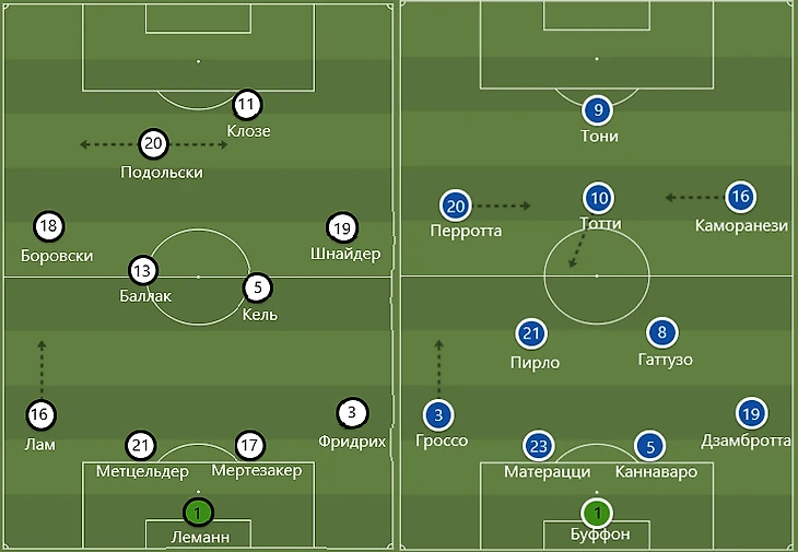 Для более вертикального развития атак Германия использовала забросы на Клозе, который безуспешно вёл борьбу с Матерацци. Марко, заменивший в старте Андреа Бардзальи, выдергивался в зону между линиями, куда шел заброс на Клозе, и вступал в борьбу. В редких случаях, когда Матерацци её проигрывал, Каннаваро страховал на высочайшем уровне.