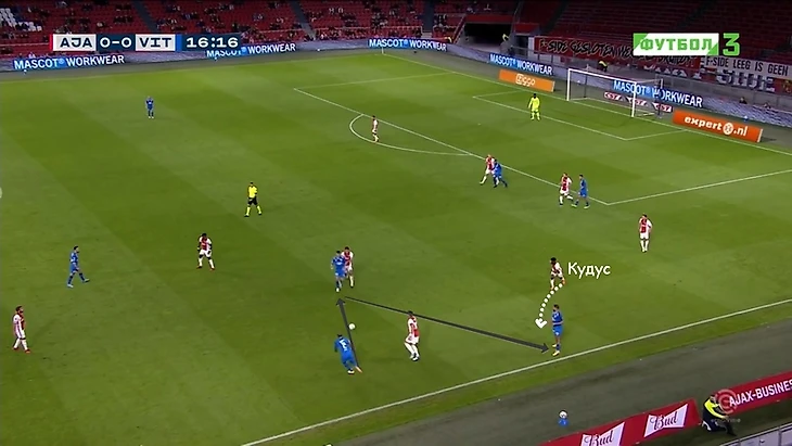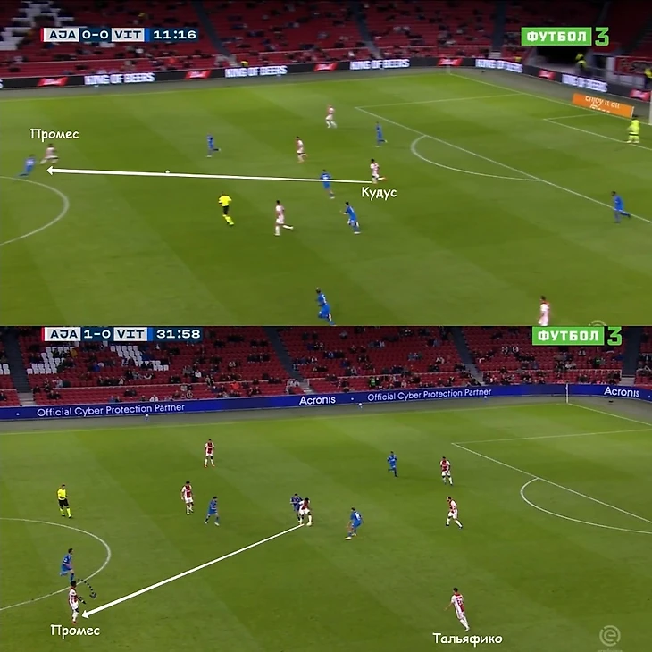 В игре с «Витессом» Кудус часто снабжал неудобными передачами Промеса. В первом случае он получил мяч без давления и имел возможность для оценки эпизода. В итоге, Кудус отдал передачу на партнера с оппонентом на плечах, да еще и не самую идеальную по точности. Во втором моменте больше напрашивался пас на Тальяфико, у которого было много свободного пространства (он даже показывает руками, мол, я свободен), но Кудус заметил только вертикальный вариант с Промесом. В итоге соперник выбил мяч у бывшего спартаковца в подкате.