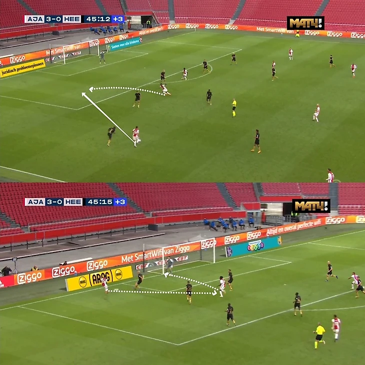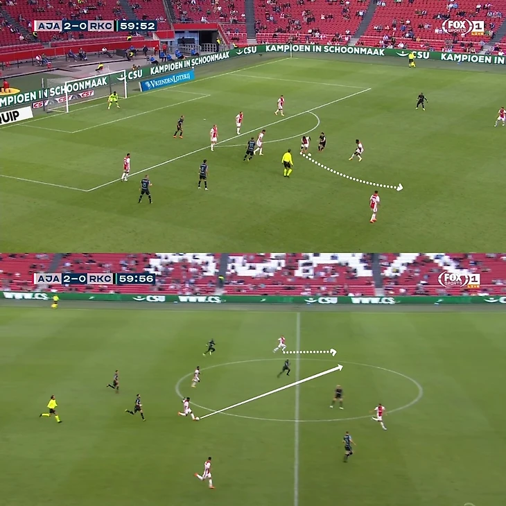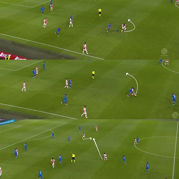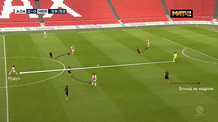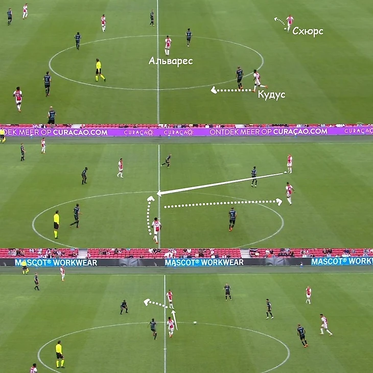 Выше типичный эпизод. Изначально Альварес открывается в центре, а Кудус движется по полуфлангу, тем временем Схюрс уходит немного шире. Далее Альварес опускается ниже и выманивает на себя соперников. Кудус замечает зону, которую освободил партнер и резко ускоряется под передачу. В итоге, «Аякс» разбил прессинг и разогнал голевую атаку.