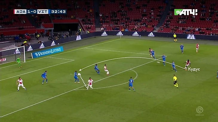 На скрине выше Кудус изначально движется к своим воротам. Под прессингом «Витесса» у него два очевидных варианта: пас назад Блинду или на вратаря для последующего лонгболла. Динамику подобных эпизодов лучше передает видео, но даже на скрине видно как унесло преследователя Кудуса после резкого разворота ганца на 180 градусов. Также при плотной опеке он неплохо укрывает мяч корпусом, часто с вытянутой рукой для контакта с оппонентом и лучшего контроля дистанции. Такие умения очень помогают команде при сохранении владения.