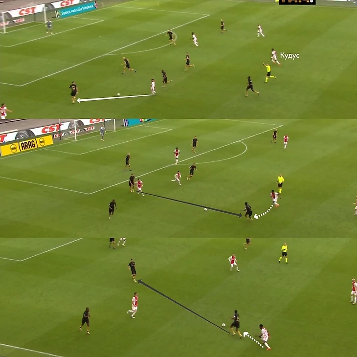 Обратите внимание — Кудусу потребовалось всего четыре секунды, чтобы вырваться на свободное пространство и развить атаку «Аякса». Причем снова Кудус играет двумя ногами — пас был отдан номинально слабой правой ногой. Примечательно, что в том матче две наиболее острые передачи Кудус отдал именно правой. Двуногость Кудуса — уже хорошее подспорье для того, чтобы стать опасным оружием в центре поля.