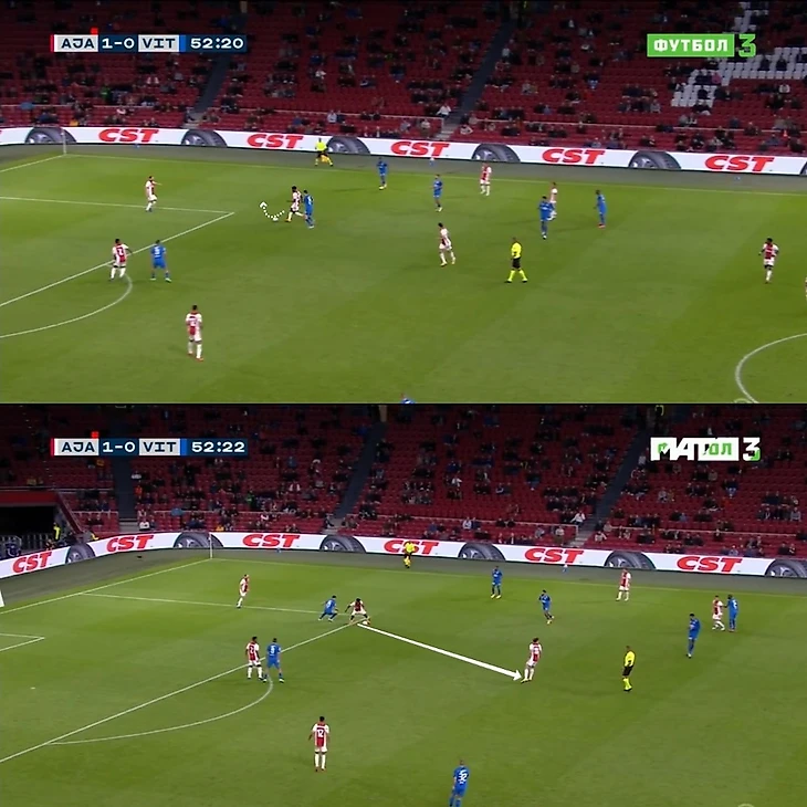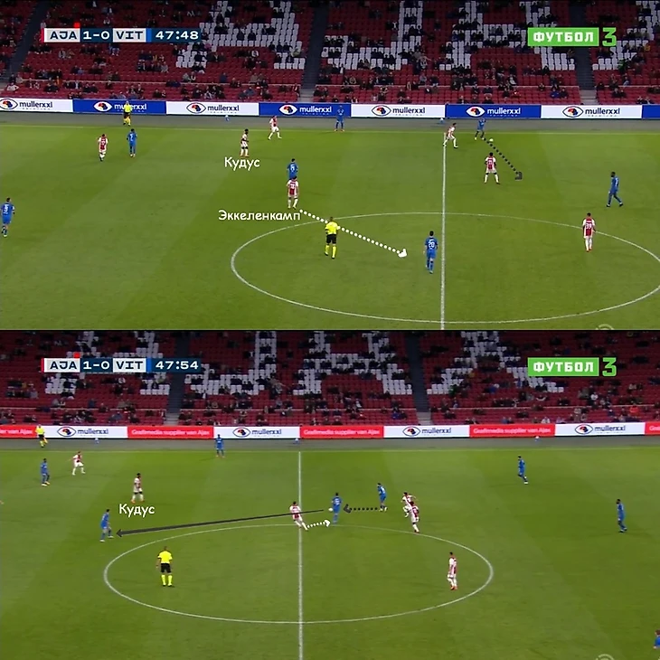 На первом скрине видно как пара опорников «Аякса» расположилась ближе к левому флангу. Но в связи с тем, что оппонент двигается в центр, Эккеленкамп корректирует позицию и переключается на соперника в центральном круге. По идее, Кудус должен в таких ситуациях страховать своего партнера, но он выключается из эпизода и ходит пешком еще несколько секунд. В результате – полный провал в центре поля и опасная контратака на ворота «Аякса».