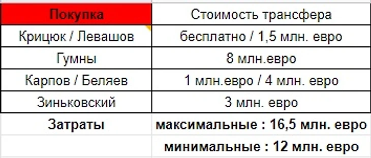 В итоге мы имеем с продажи игроков 8,5 млн. евро, а на покупку тратим от 12 до 16 млн.евро.