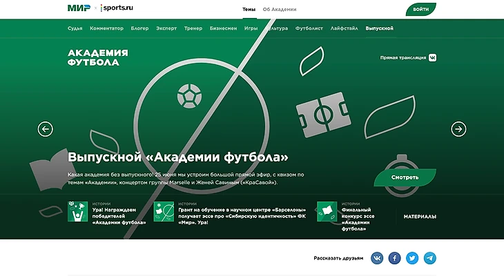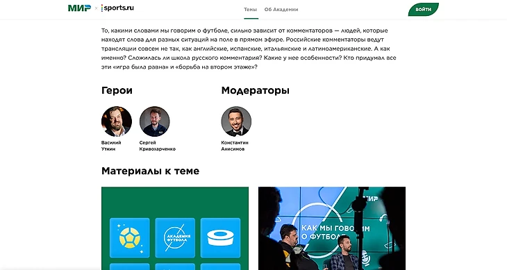Пожалуй, самым знаковым проектом, реализованным вместе с «Миром», стала для нас «Академия футбола» – масштабная образовательная платформа, помогающая одним болельщикам разобраться в азах игры, а другим – смотреть футбол осмысленнее и профессиональнее.