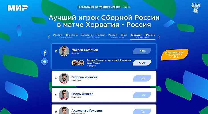В следующем совместном проекте мы сконцентрировались на главном активе «Мира» – футбольной сборной России. Но не забыли и про болельщиков! На отдельной странице мы разместили форму для голосования за лучшего игрока матча в составе сборной, а также игру бинго. Перед каждым матчем нашей команды пользователь получал уникальную карточку, содержащую в себе события с разными вероятностями (от чего-то очевидного до природных катаклизмов). Болельщики с максимумом совпавших событий получали призы, в том числе – возможность бесплатно поехать на следующий матч сборной и лично наградить игрока национальной команды, признанного самым ценным (MVP) по итогам голосования.