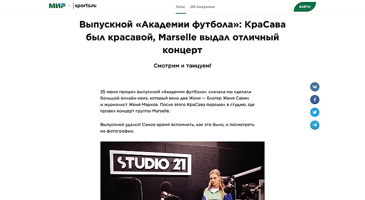 Несмотря на пандемию и перенос Евро-2020, «Академия футбола» стала самым массовым образовательным мероприятием, посвященным футболу: – 2,18 миллиона посетителей платформы за время ее работы, – сотни тысяч просмотров у каждый из 17 эфиров в ВК, – 70 полноценных редакционных материалов, – 20 интерактивных аттракционов и миллионы лайков. А еще – настоящий выпускной экзамен, капсульная коллекция мерча и последний звонок с L’One и другими звездами.