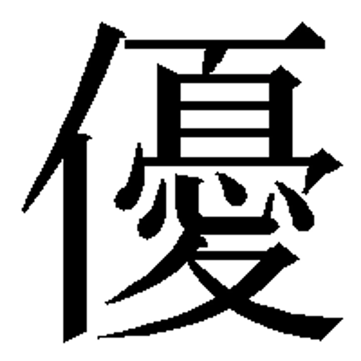 У него 17 черточек и ключом его является знак 人, означающий "человек". Как и большинство кандзи, этот имеет несколько чтений - четыре, если быть точным. Одно из этих чтений, произносится, как слегка растянутое наше "ю" и означает "превосходный, отличный, исключительный". Именно с этого кандзи в таком чтении начинаются японские слова, означающие "победа", "чемпионский титул" и "чемпион", а такоже глагол "побеждать". Разумеется, этот иероглиф изпользуется и в именах людей...