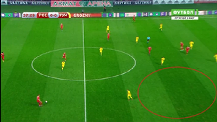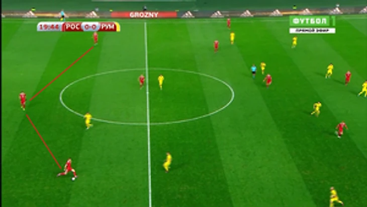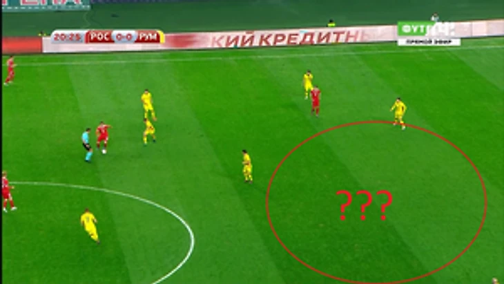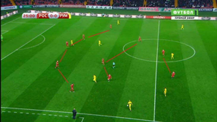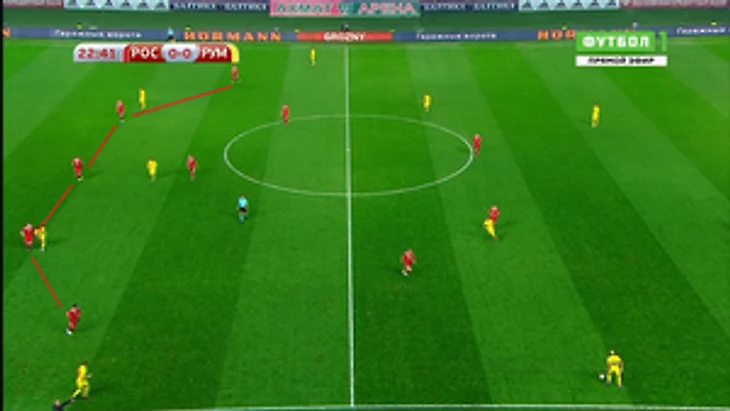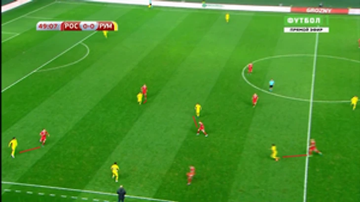 Конечно же, к ним опускались Жирков и Самедов, которые все вместе образовывали линию в 5 защитников в оборонительной фазе.