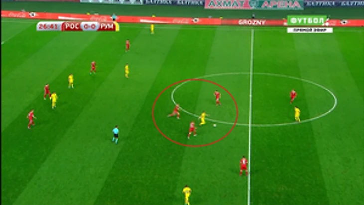 Но лучше всего получалось прессинговать у Глушакова, который отлично читал задумки противника. После его отбора в центре поля, и получился очень опасный момент у сборной России, но не смогли забить, потому что... Кокорин.