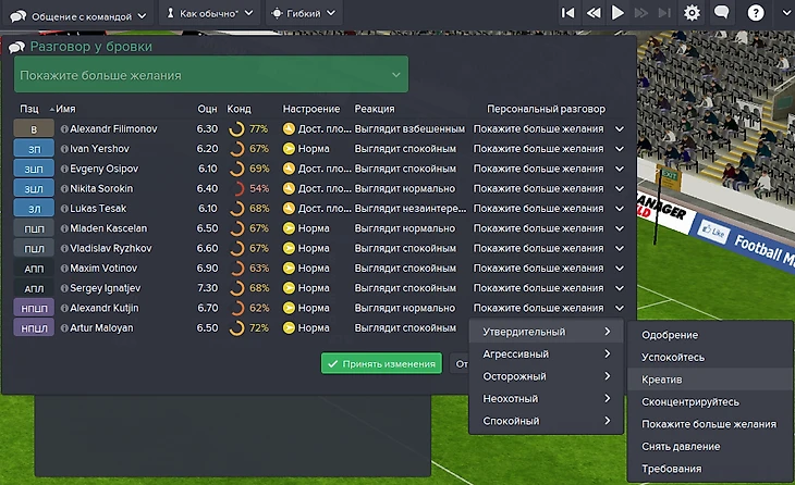 Прямо во время матча можно накричать на игроков или похвалить, а не как раньше только перед началом матча, в перерыве и в конце. Ух, сколько новых инструментов у нас, чтобы влиять на результат!