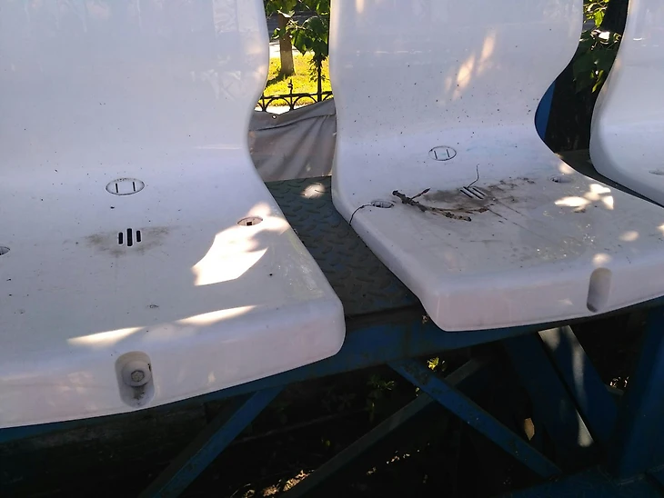 Проблем с попаданием на стадион никаких не возникло. Приветливая бабушка на входе, суровые стражи порядка возле рамок металлодетектора. Далее был выбор размещения. На стадионе три трибуны: одна (за воротами) традиционно считается "фанатской", большая трибуна (под самым пеклом, там располагаются любители позагорать) и маленькая - в теньке. На первый тайм решаю сесть на малую трибуну т.к. нет большого желания щуриться от высоко зависшего солнца. Тут и появляется первая проблема - грязные сидения. Понятное дело, что это не матч сборной или РФПЛ, но болельщик платит 100 рублей за услугу, а взамен такое отношение. Все-таки 2017 год, можно и добавить немного сервиса. Не сказать, что эти сидушки портят настроение сильно, но поход на футбол в родном городе становится не традицией, а неуместной шуткой. Спасибо женщинам, которые поделились влажными салфетками и место было успешно очищенно (пусть и с трудом т.к. грязь уже въелась). Рядовые болельщики без салфеток пользуются другими средствами защиты одежды, к примеру - подстеленными газетками и пакетами.