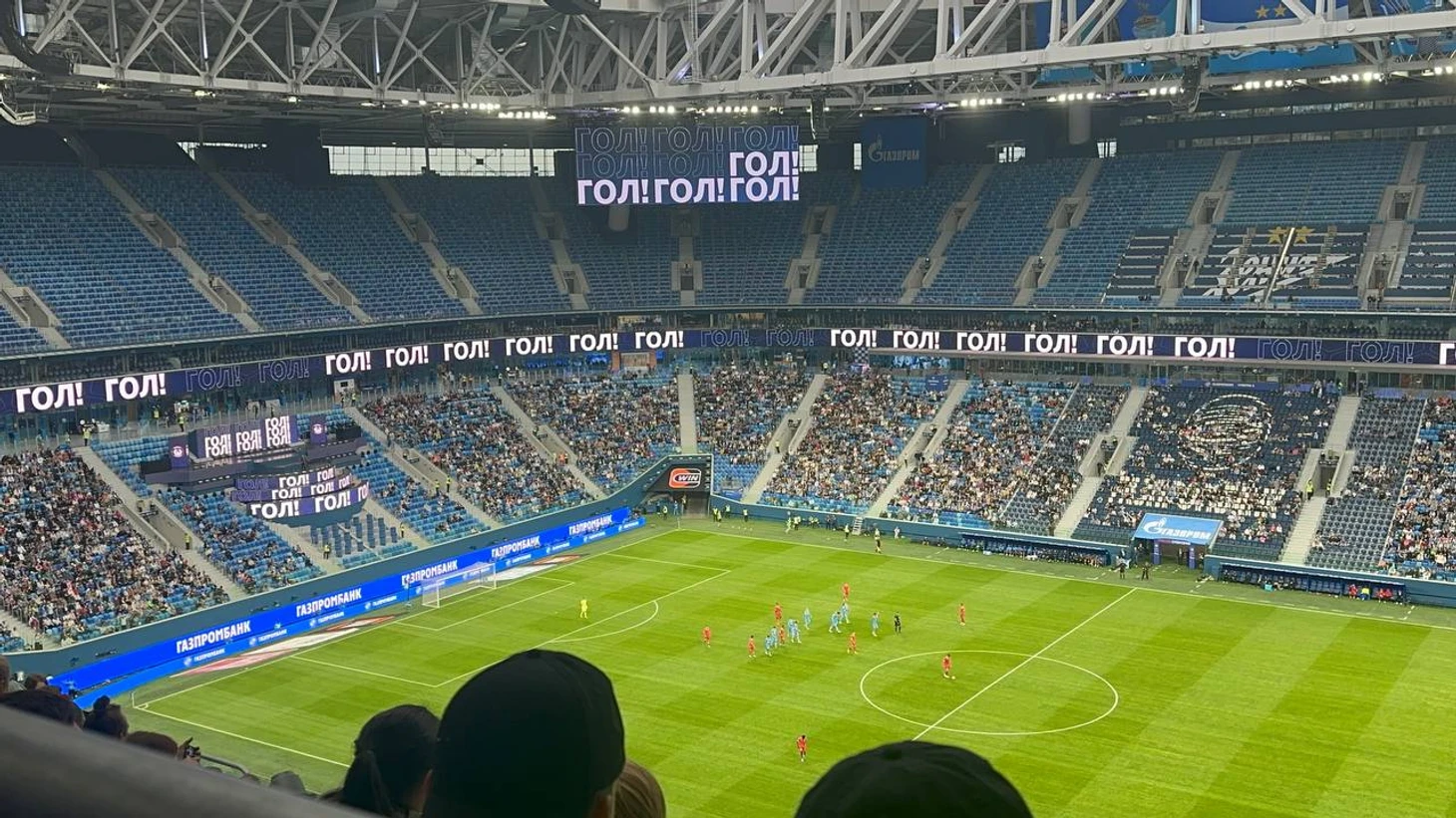 Были и исключения: рядом со мной сидел дядя, который со своим другом делился историями и обсуждениями про футбол, но не более. На поле в начале матча атаковал только «Зенит», и первый гол пришел быстро – забил Глущенков, который выделялся желанием, как и Кассьерра, который тоже забил. И при этом взятии ворот сначала случилась неразбериха: диктор объявил, что Глущенков оформил дубль. В этот обман было легко поверить, потому что, особенно с верхних ярусов, казалось, что Максим забил, но потом оказалось и для болельщиков, и для диктора (голос которого напоминал мне Геннадия Орлова) ясно, что Кассьерра выскочил из-под своего одноклубника и забил.