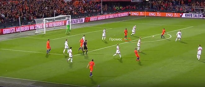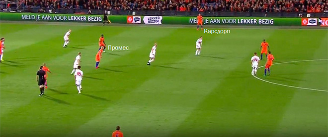 Номинальным левым вингером Блинд ставит Дави Классена, блуждающего художника по натуре. Все 90 минут матча с Белоруссией Классен сваливался в центр, дублируя Уэсли Снейдера и насыщая середину, а левый фланг отдавался на откуп Дейли Блинду, бесперебойно подававшему на протяжении всего матча. Справа же взаимодействуют Промес и Рик Карсдорп из «Фейеноорда» – очень приятно отметить, что талант защитника, которого сейчас хвалят все, мы заметили ещё прошлой зимой. Промес иногда, как Классен, смещается в центр, чтобы открыть Карсдорпу свободное пространство на фланге (как на скриншоте ниже), но чаще они взаимодействуют на краю в паре.