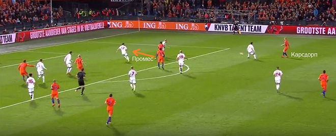 Разница между фланговыми связками в «Спартаке» и сборной Нидерландов заключается в том, насколько удачно Промеса подпитывают передачами из глубины фланга. У Ещенко это получается нечасто – гораздо чаще Квинси получает мяч от Фернандо, Глушакова или кого-то из красно-белых «десяток» (Попов/Джано). Карсдорп же старался по максимуму играть не в центр, а именно вперёд, на Промеса. Ту самую дополнительную опцию Рик использует очень правильно.
