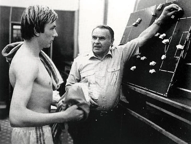 Константин Иванович Бесков учит играть в футбол Сергея Шавло