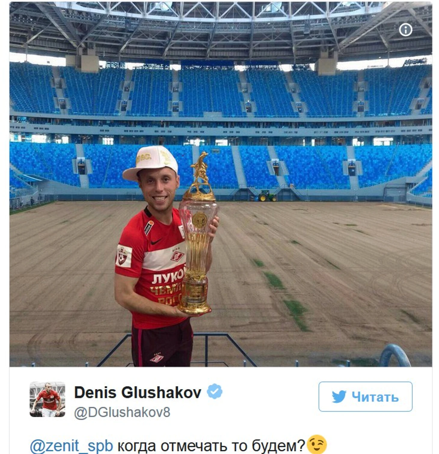 На отредактированной фотографии Глушаков стоит с кубком победителя чемпионата России на фоне поля стадиона «Санкт-Петербург», на котором отсутствует газон.