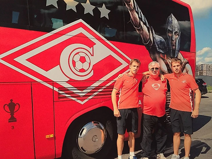 — Это и мой второй дом, и офис, и кафе — тут вся моя история. Вот, смотри, мальчишки первое чемпионство взяли. Вот я на фото с тем, ещё серебристым автобусом. Вот новый, красный. Хотя какой он новый?! Девять лет уже машине. Всё поменять собирались, тянули. «Валя, — говорили. – Ну если титул возьмём, точно обновим». В итоге, кажется, только меня обновили, автобуса чего-то я не вижу. — Знаешь, — продолжает Валентин. – Чемпионство-то начали праздновать уже после ЦСКА. Выиграли – и всё понятно стало, 10 очков отрыва. Глушаков прямо в раздевалке объявил: «Всех приглашаю в ресторан». Прямо на стадионе загрузились в автобус, поехали на набережную в «Лужники», по дороге пели песни, прыгали, веселились. Для водителя микрофон приспособлен – вот Дениска нашёл его, начал кричать, заводить. Хорошо было…